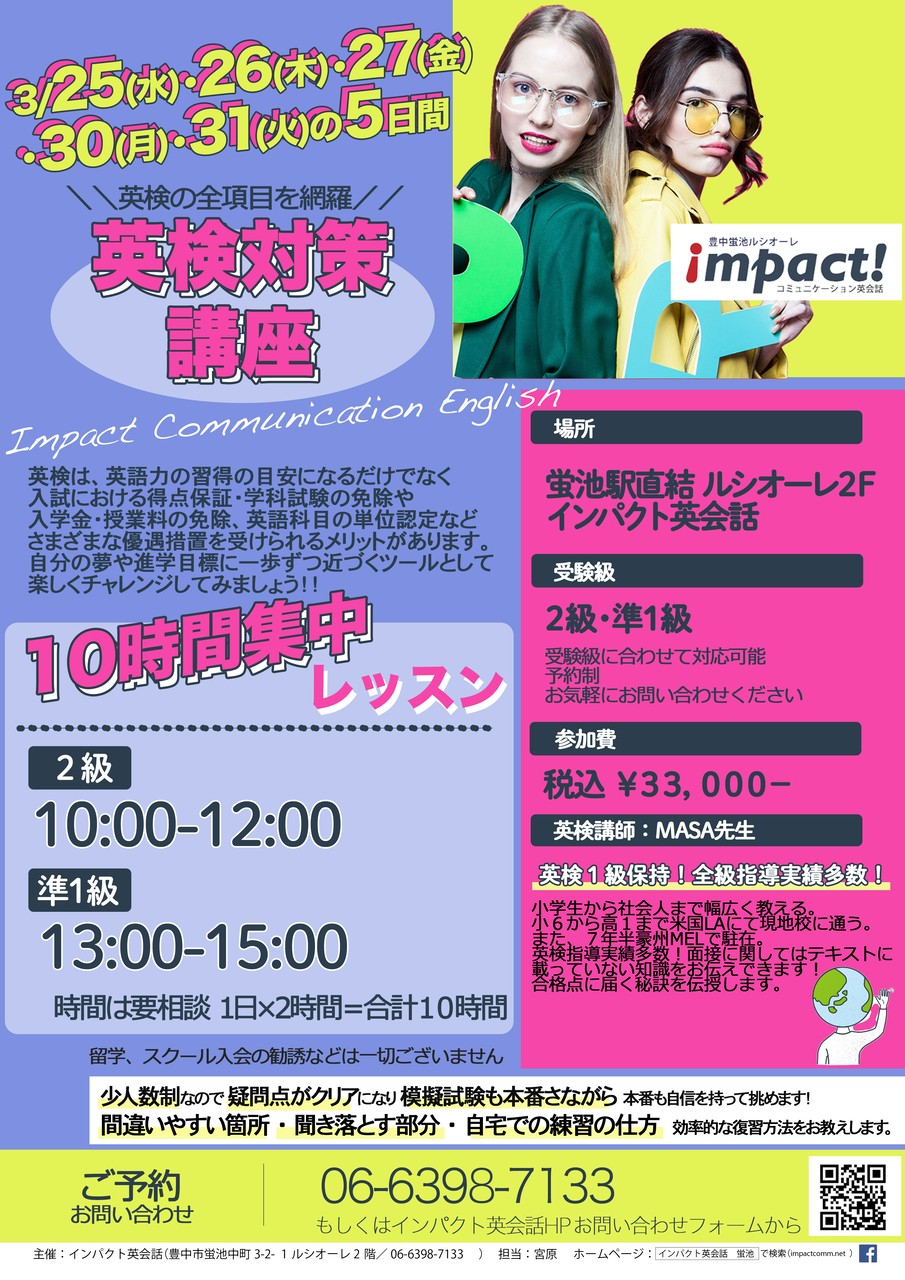 入試で有利な英検を取得したいが継続的に通うのは難しい、苦手項目を重点的に補強したい、という方へ向けて、インパクト英会話では集中講座を行ないます。
